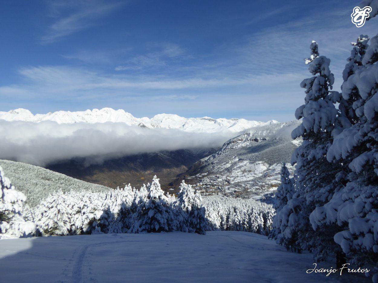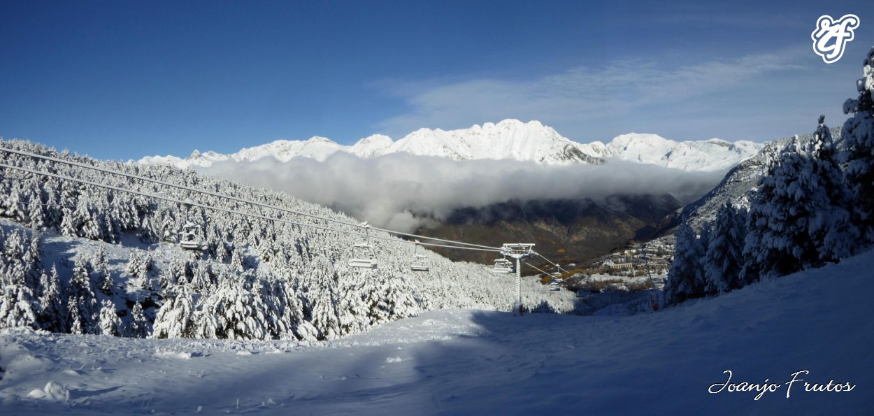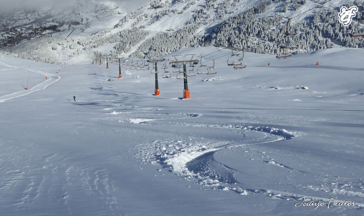 Ahora sí, después de tanta danza a la nevada fantástica, hoy hemos disfrutado de la nieve polvo recién caída después de días de lluvia, el temporal de sur anoche se desplomó la cota de nieve y de que manera, estamos en noviembre, no es una cosa extraña, pero por desgracia no se produce cada año, sino viene ninguna catástrofe Cerler-Aramón está preparada para abrir, como veréis en las fotos hay bastante acumulación, zonas altas rozando el metro o más, y en cota 2000, se pasa de los 60 cms.