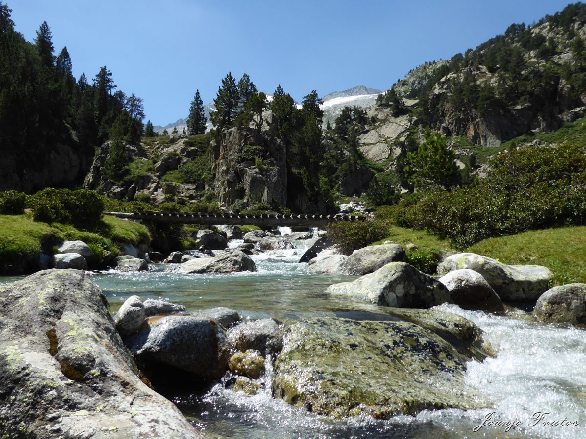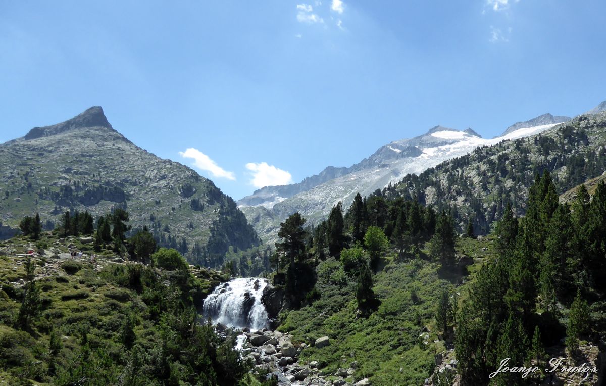 Un paisaje increíble y dejando disfrutar a los senderistas que subían a refrescarse en las playas naturales del Plan y con vistas al pico del Aneto de 3.404m.