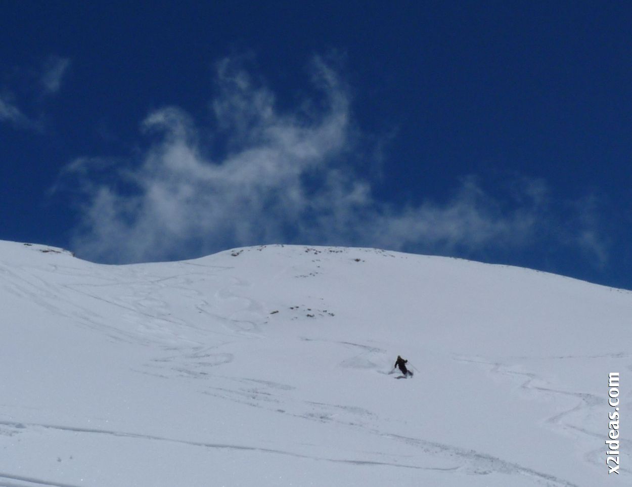 Hoy por fin he accedido al Pico de Castanesa, esa ampliación natural que debería tener Cerler en el caso de que si hiciera alguna. Por lo accesible y el dominio esquiable que comportaría ello. Estamos a 20/5/2013 y hemos disfrutado de otro día con nieve polvo y suelta (+/- 30 cms), demasiado para la época en que estamos. Subida fácil desde el camino forestal, atravesando un bosque y llegar a la planicie de Vallvardera, desde allí en una continuada subida se llegará al pico, vistas a la estación de esquí, a Cerler, y la cara sur del Macizo de las Maladetas.