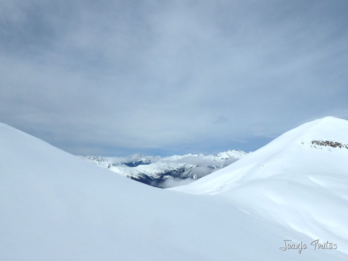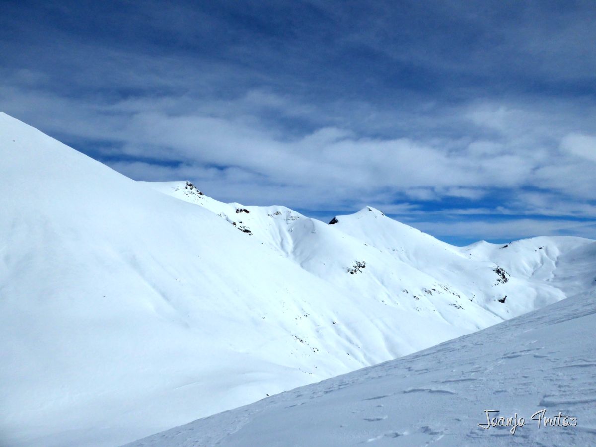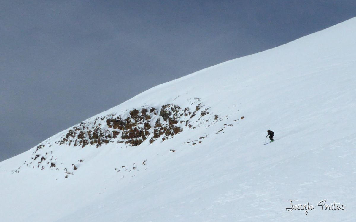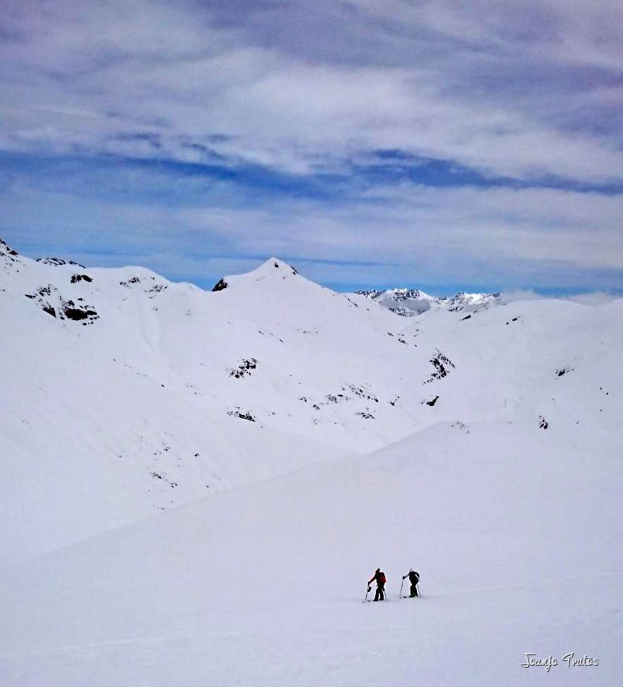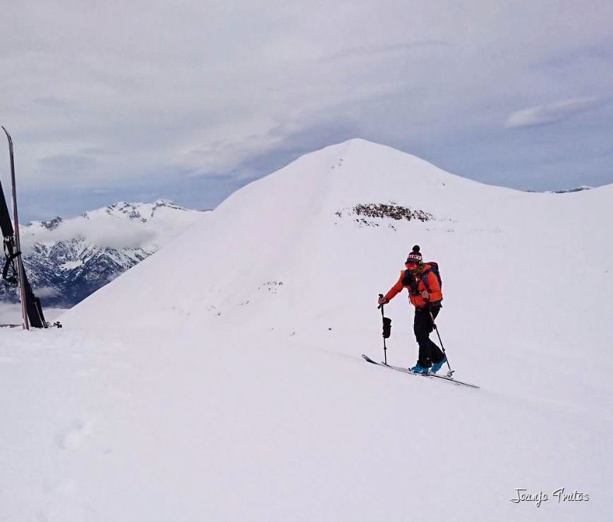 Collado de Gallinero hacia Urmella espectacular, ni que decir que lo hemos estrenado, subida con skimo al monte cercano de la Tuca de Urmella y nuevamente bajada con nieve polvo, vuelta a las focas y ahora sí a la tuqueta y luego bajada de «agroski» hasta Arasán, porteo no muy largo y excelente y caliente comida en el restaurante del pueblo elegido como final de ruta.