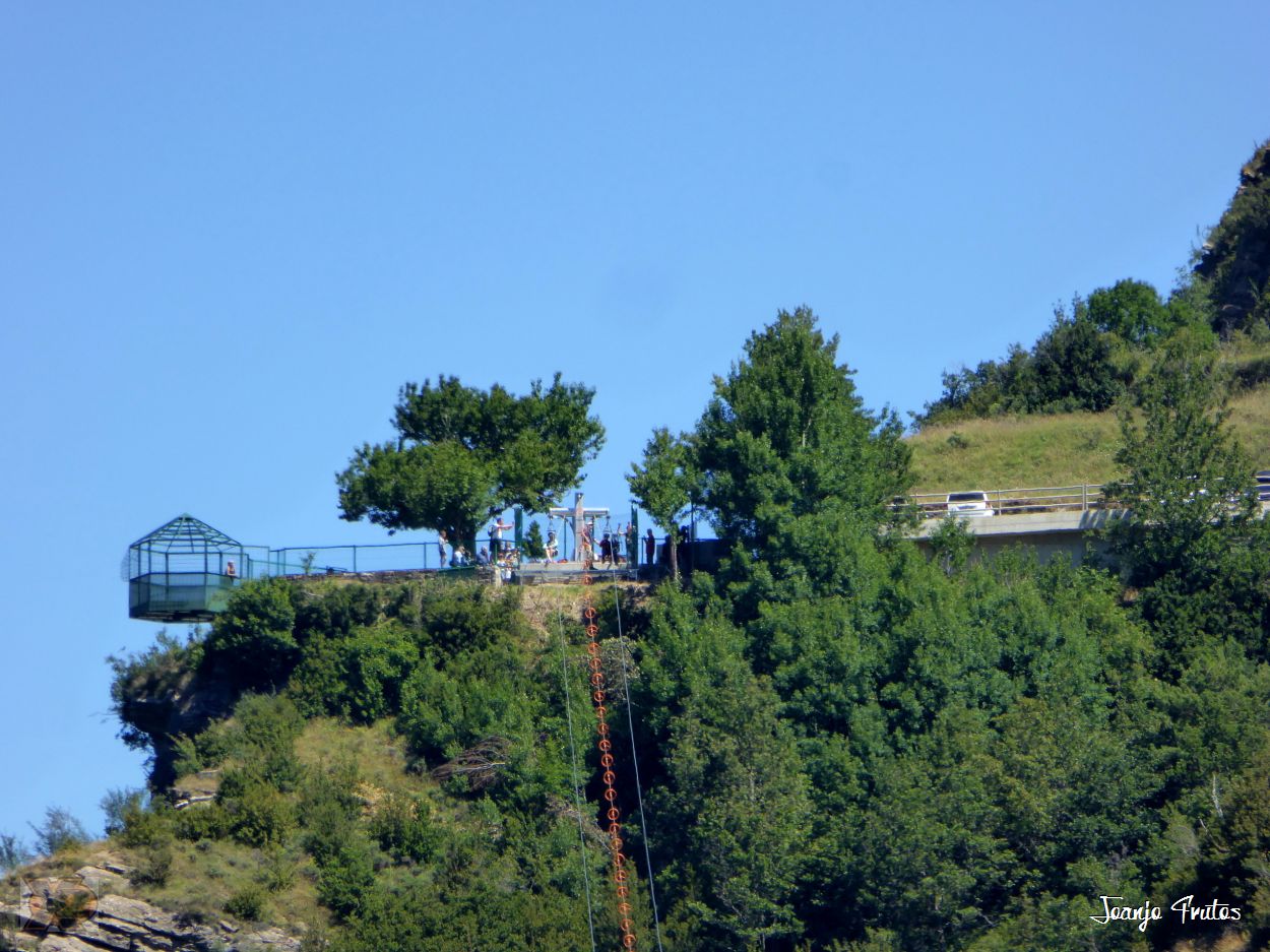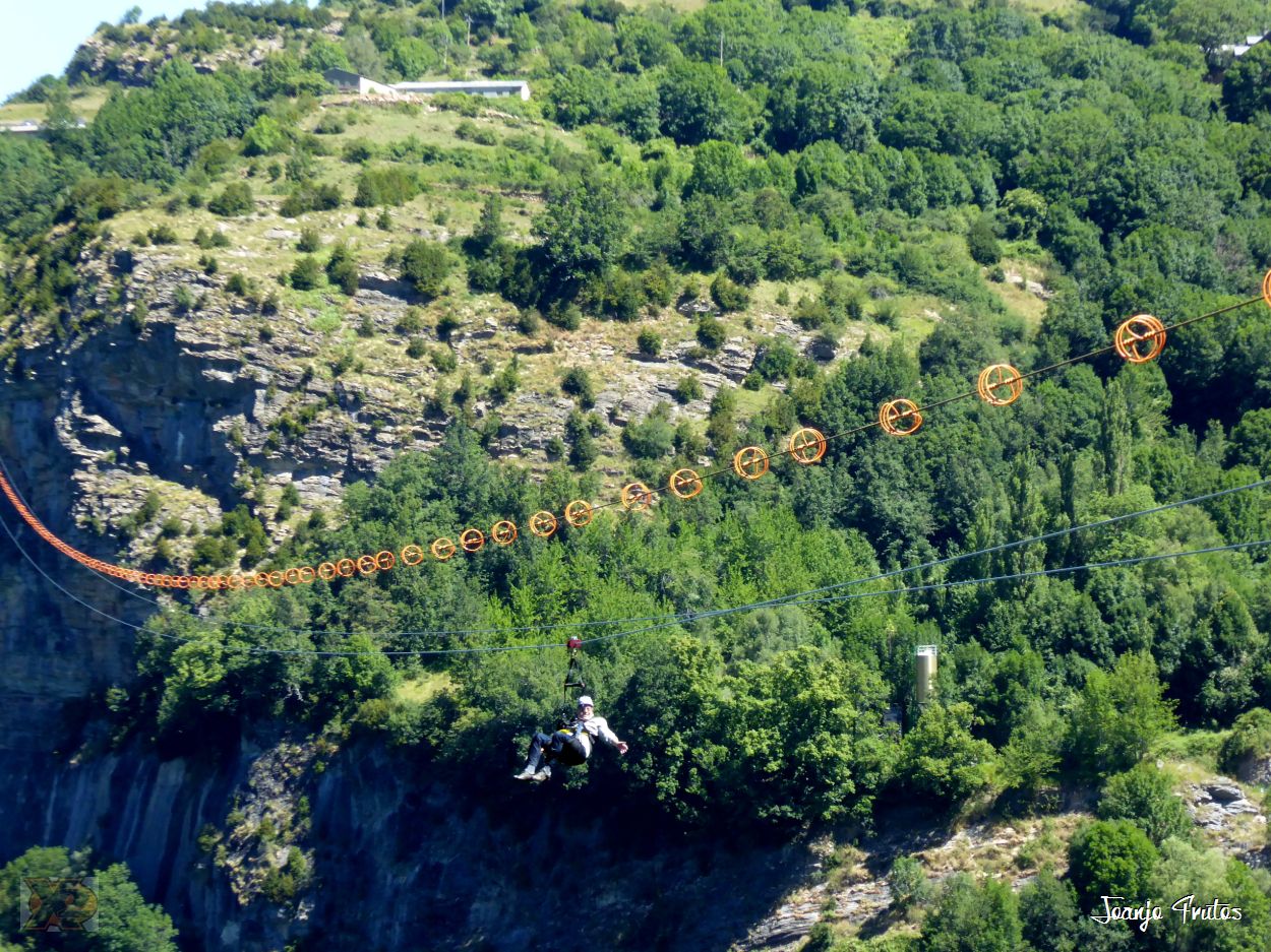 Un salto y 950 metros de cable nos separa de la llegada, muy recomendable, se nos hace corto y eso que es una de las más largas de Europa, sobrevuela a 120 m de altura sobre el lago de Búbal.