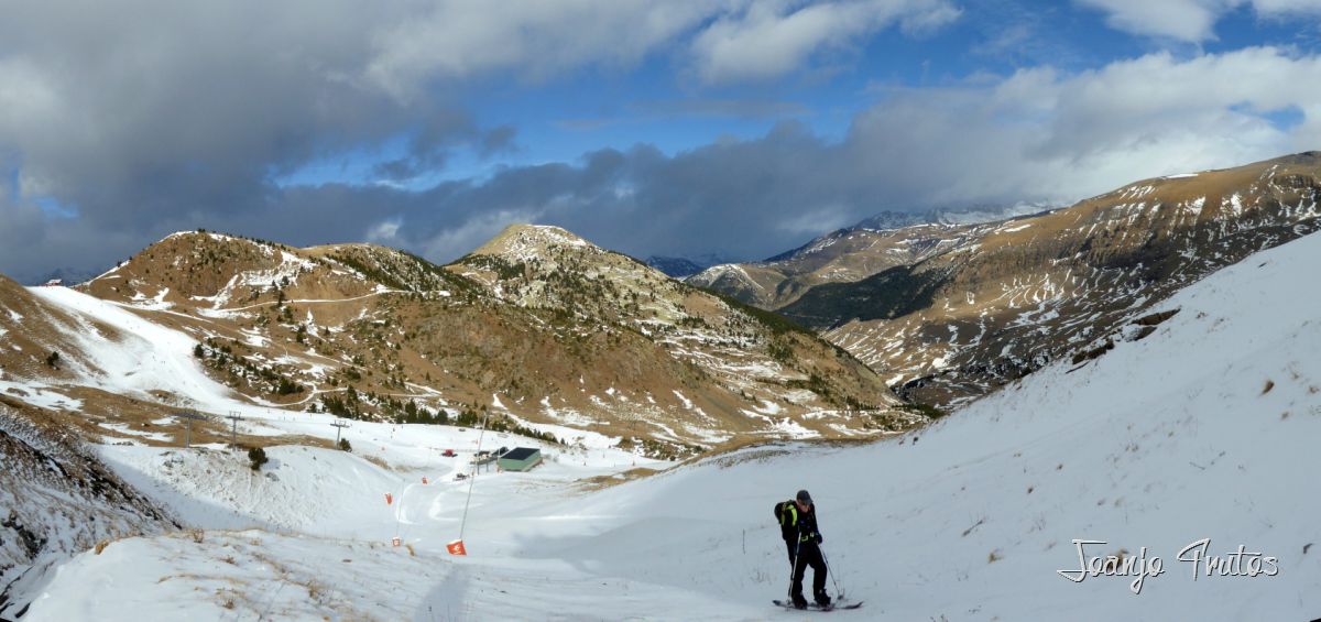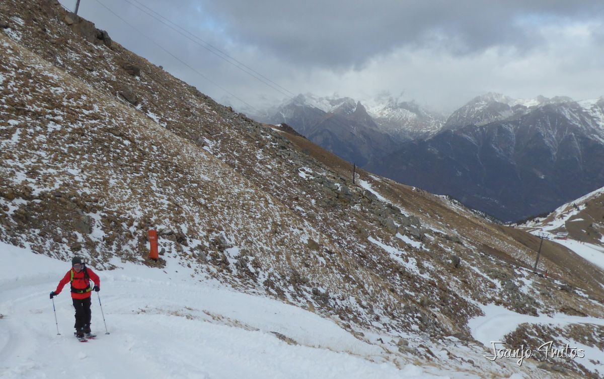 Día raro en el Valle de Benasque, temperaturas altas y lloviznando, plan de foquear por Llanos del Hospital lo suspendemos, llegaríamos mojados arriba, volvemos a Cerler, aunque sabemos de lo justo que está todo, subimos a Gallinero, la ingeniería realizada por parte de la estación es digna de estudio. Sin haber tenido de cara este fin de otoño, han podido abrir pistas para los esquiadores más ansiosos.