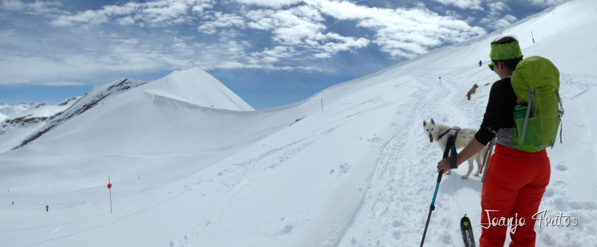 | Llegando arriba de Gallinero. Celebramos el 7 de 7, esquí de travesía por Gallinero, vuelven los días soleados, subida dura por el calor, la nieve en bajada con cambios entre nieve primavera pesada y nieve costra en las zonas menos soleadas, pedía inclinación. Siempre es una gozada llegar arriba al pico, esta vez creo que me he venido abajo y tan solo he llegado a la salida del telesilla, ahora puedo entender al séptimo día descansó, jeje. Subida con amigos y Ash, a parte de conocidos en la subida, parking casi lleno de coches y las imágenes muestran como está la estación, este abril sigo diciendo que se recordará en años. Por cierto las estaciones de esquí que han abierto remontes en el Pirineo han hecho pleno. |