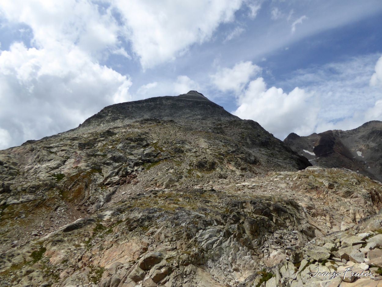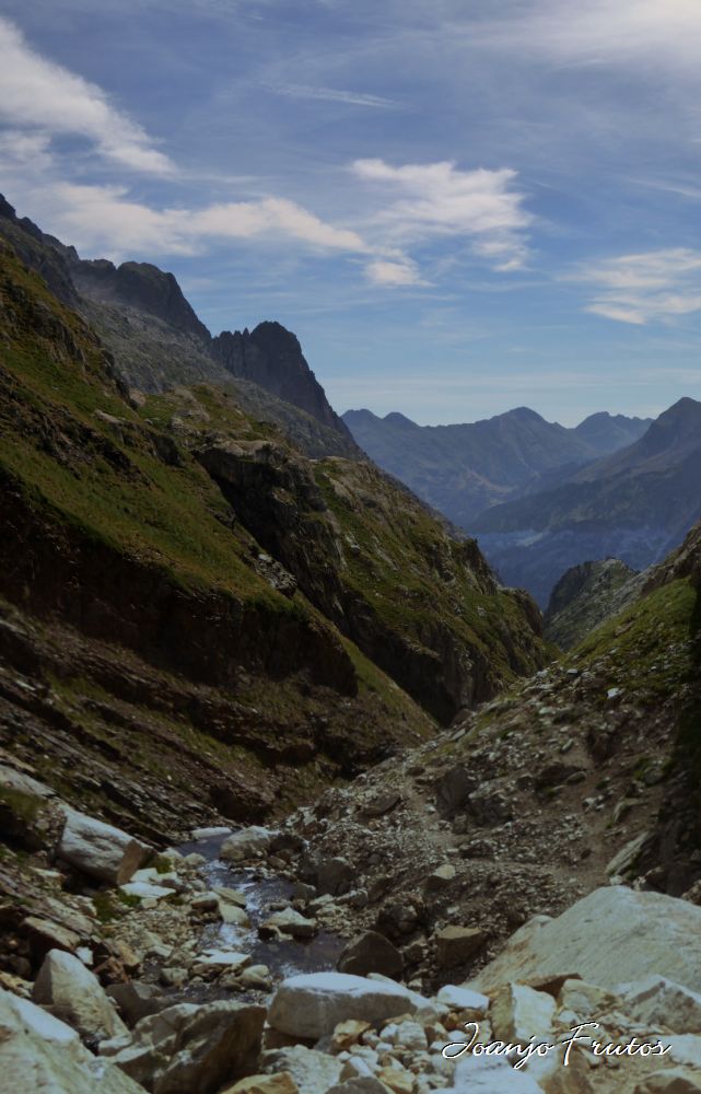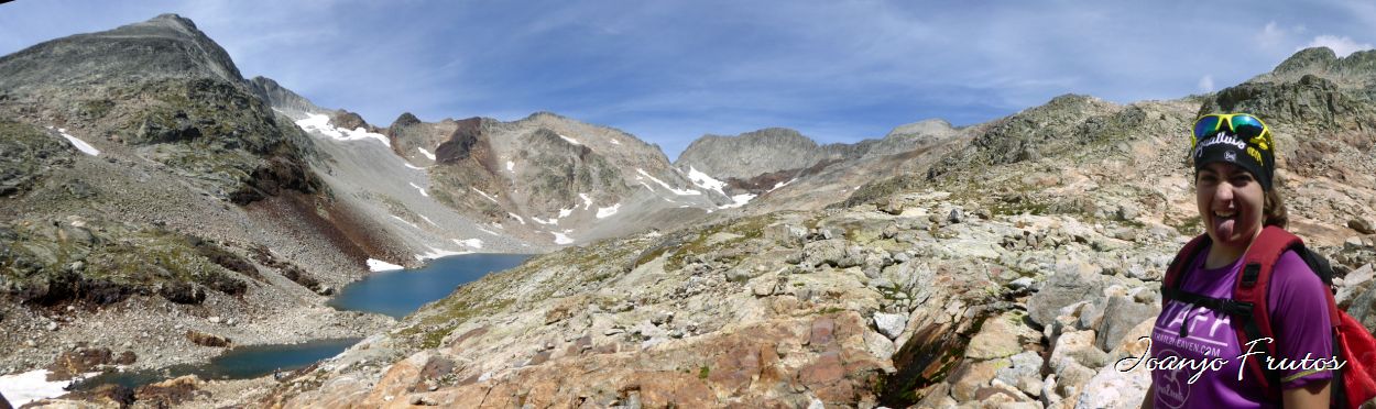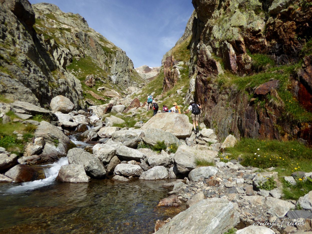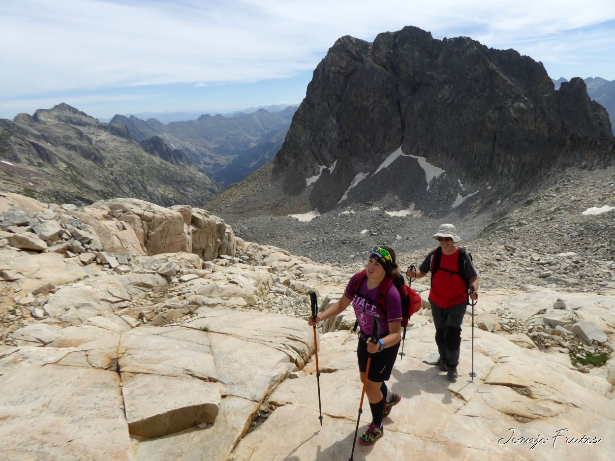 Excursión exigente, entramos por el Valle de Remuñe hasta el fondo, donde empezaremos a subir bastantes metros dejando a mano derecha las vistas a la Forqueta de Remuñe, Maupás y tal como ascendemos, unas vistas increíbles del macizo de Maladetas y hasta el Valle de Aigualluts, llegamos al collado, un gran pedregal por cierto, empezamos a ver el pico del Perdiguero y a sus pies el ibón que buscábamos, el Blanco de Literola, rodeado de tresmiles, bastante extenso y con gélidas aguas, alguno las probó a +/- 2750 m., toca el momento de hidratarse y comer después de unas 3h 30′ de caminata. Subida exigente pero nada peligrosa.