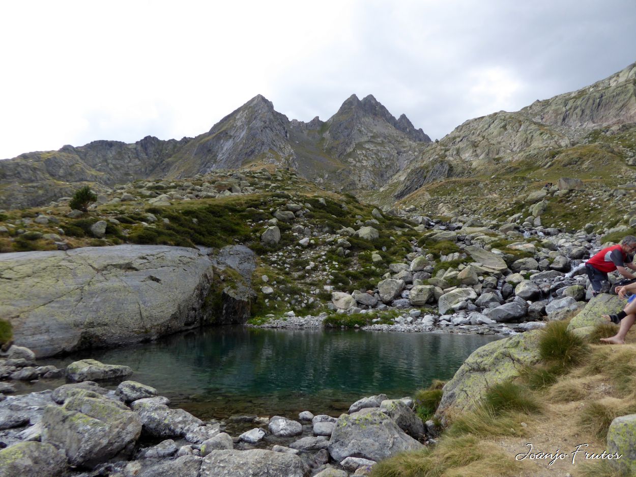 Cuando empezamos a bajar decidimos usar el sendero de mano izquierda bien señalado con hitos, en principio más asequible que el que baja por mano derecha hasta el otro ibón. Nuestra elección solamente tiene algún paso expuesto pero por lo demás es muy transitable, enseguida se abre al pasar el Perdigueret, no sin antes tener vistas al Posets, se abre el Valle de Literola, con vistas al Valle de Cregüeña, Cerler estación y finalmente llegamos al ibón antes de llegar al desvío a la Cabaña de Literola, donde el baño es casi obligatorio, nos refrescamos y vamos a buscar ya el bosque que nos dejará hasta donde habíamos dejado un coche para ir a buscar los otros, aparcados a la entrada de Remuñe.