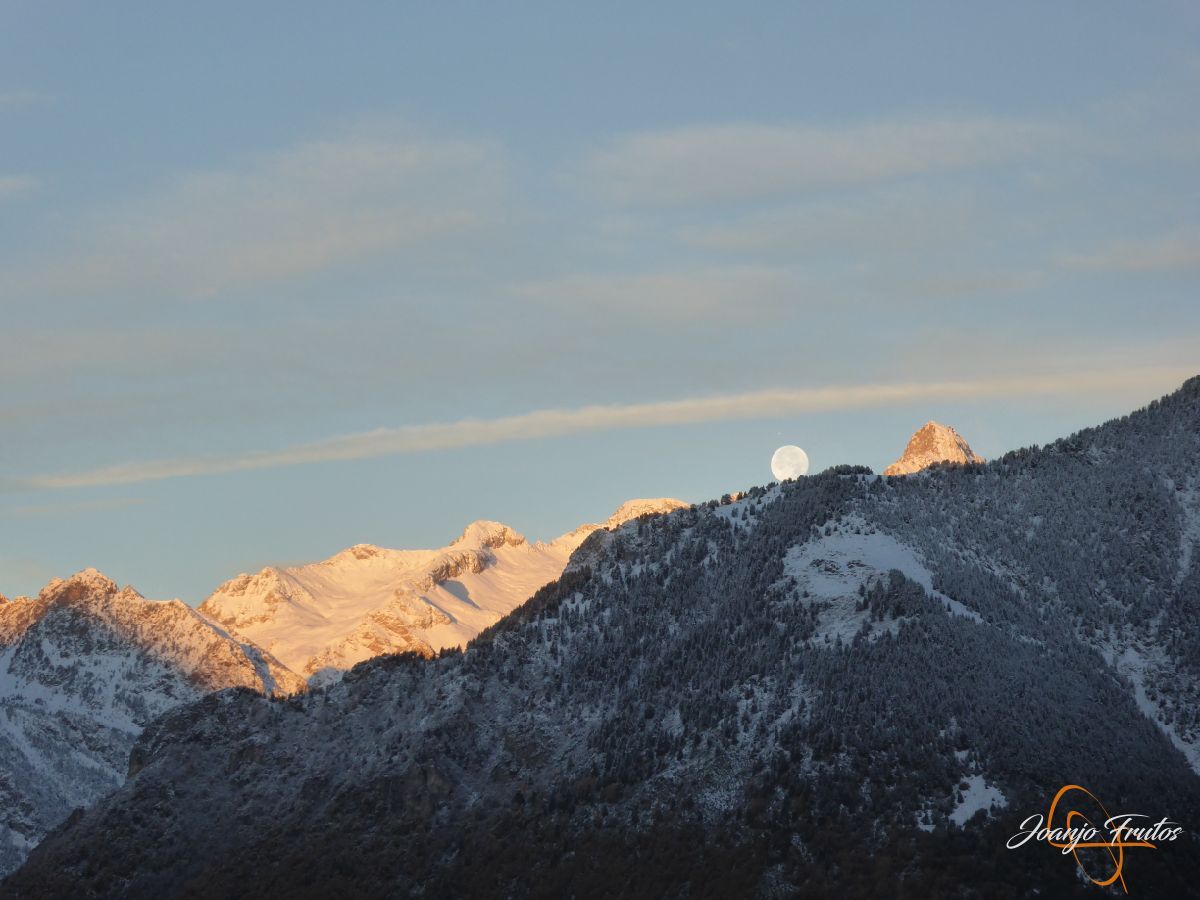 Después de la nevada llega la calma, la noche fría y serena, cielos despejados y la luz de la Luna como farol de la montaña y al amanecer también nos deja su espectáculo jugando al escondite …