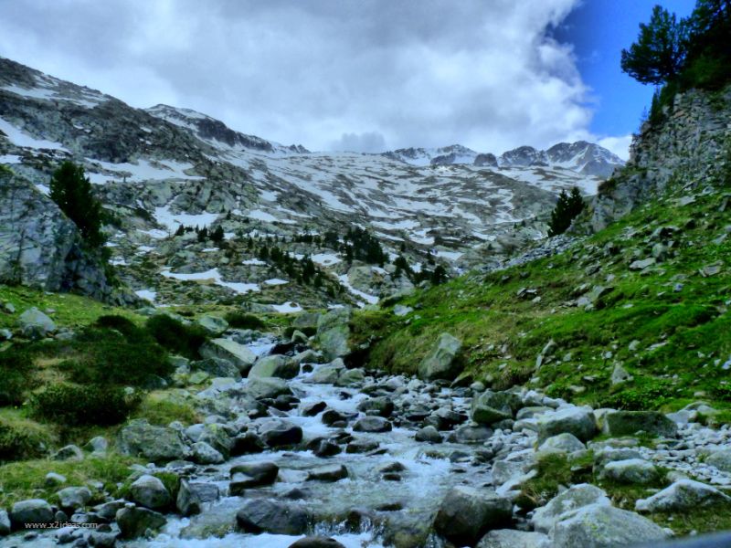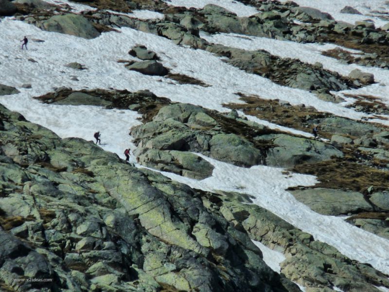 Empezamos la excursión, no sin antes mirar hacia arriba, ha blanqueado esta noche la zona más alta del glaciar. Y vemos la peregrinación hacia Aneto y proximidades …