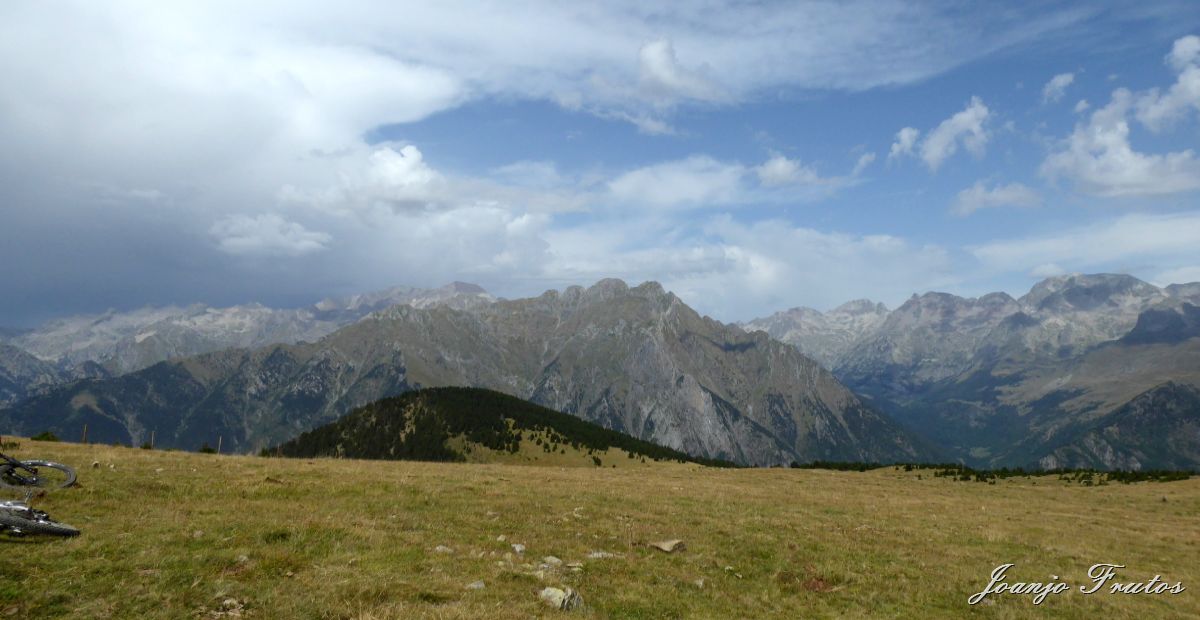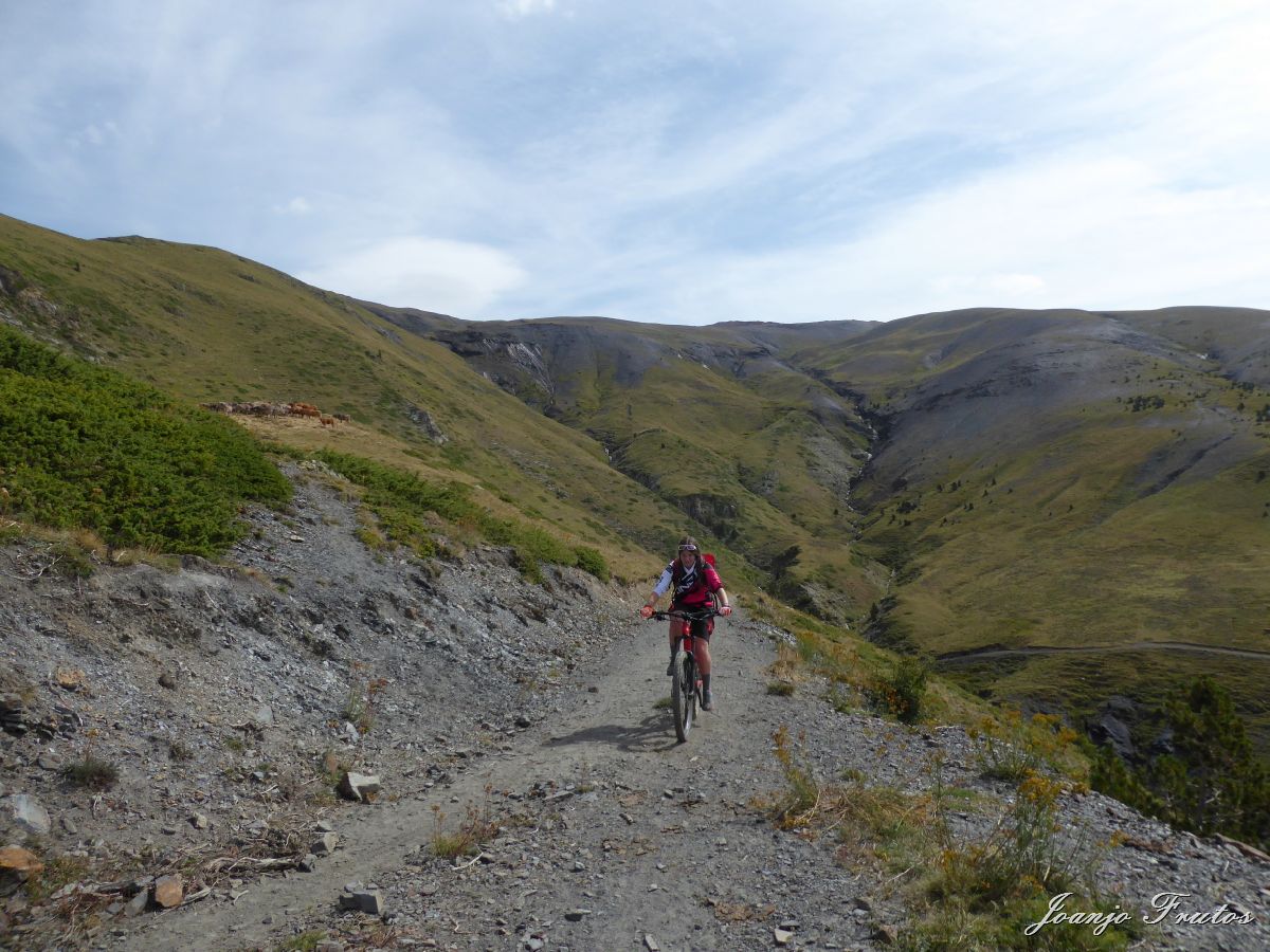 Salimos desde Ampriu, cogemos la pista de la Cabaña de Ardonés, desde aquí se hace durilla la subida hasta la tuca de Picalbo 2.270 m. , desde aquí bajada hasta Benasque, senderos que recorro muchas veces con otro propósito. Divertido y subidón de adrenalina, tengo que ir con cuidado que el resto del grupo son más jóvenes y con más experiencia de como funcionan estas bicicletas.