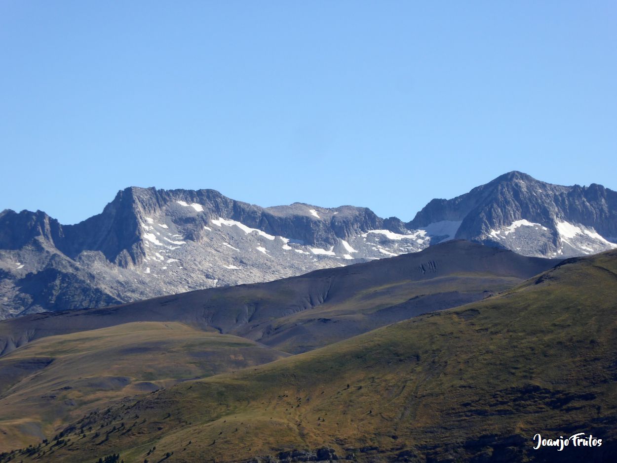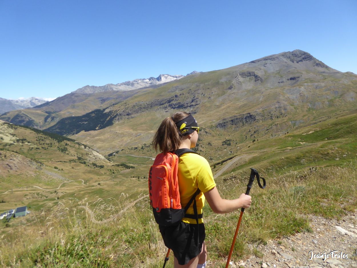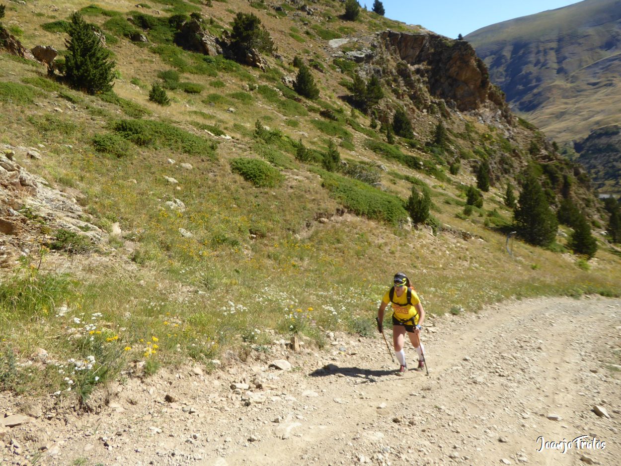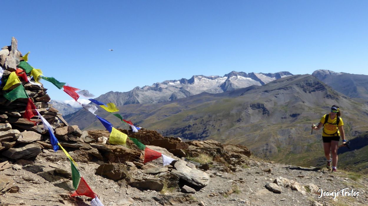 Aramón-Cerler, aparcamos en Ampriu y subimos por la pista hasta Colladeta y luego seguimos por Perdiz Blanca hasta encontrar la pista de Marmotas y por el flanco derecho seguimos el sendero de la cresta maracado en «verde y negro» ( pequeño itinerario) hasta la misma cumbre, nos la encontramos engalanado con banderitas tipo campamentos bases del Tibet, buena y simpática idea, cuatro fotos de rigor y casi a la carrera volvemos para Ampriu siguiendo la pista de servicio de Gallinero, +/- 800m de desnivel más en las piernas, a este paso me apuntaré a la 25K de