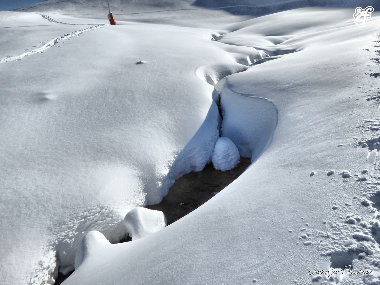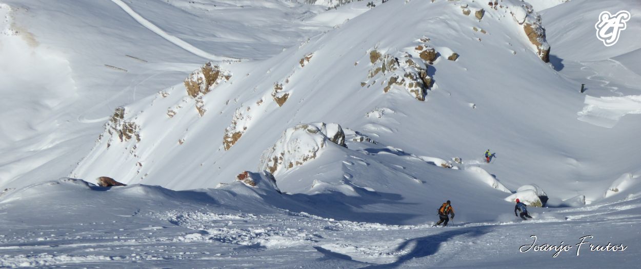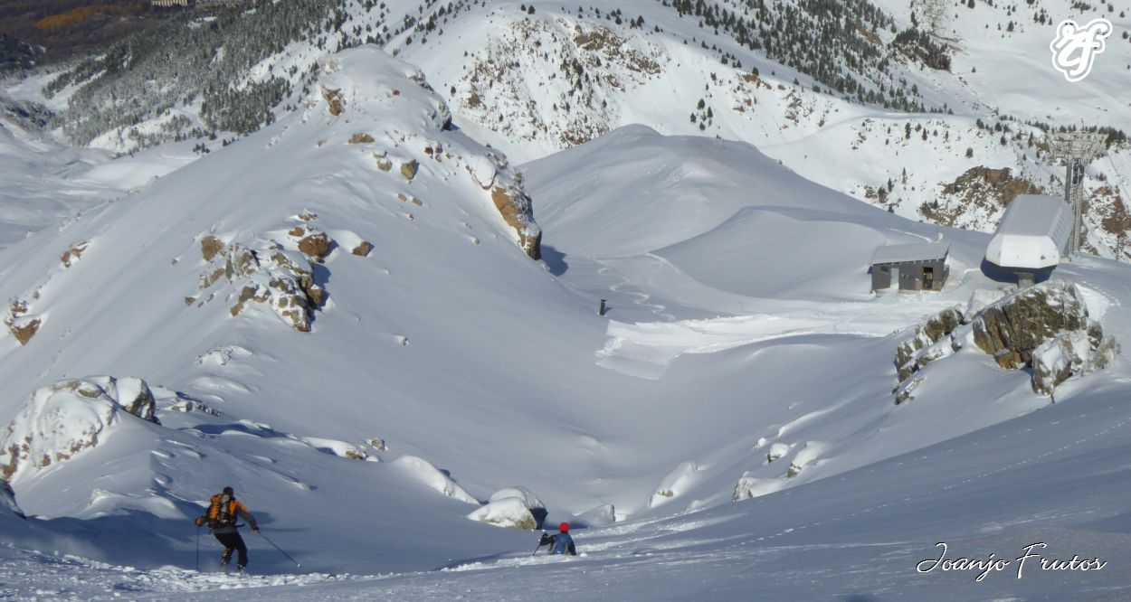 Todavía hemos esquiado muchas curvas con ·powder·, nieve suelta y seca, solamente una advertencia a todos los practicantes de skimo, cuidado debajo de los cañones, pensad que han soltado humedad para apelmazar y hay tramos helados.