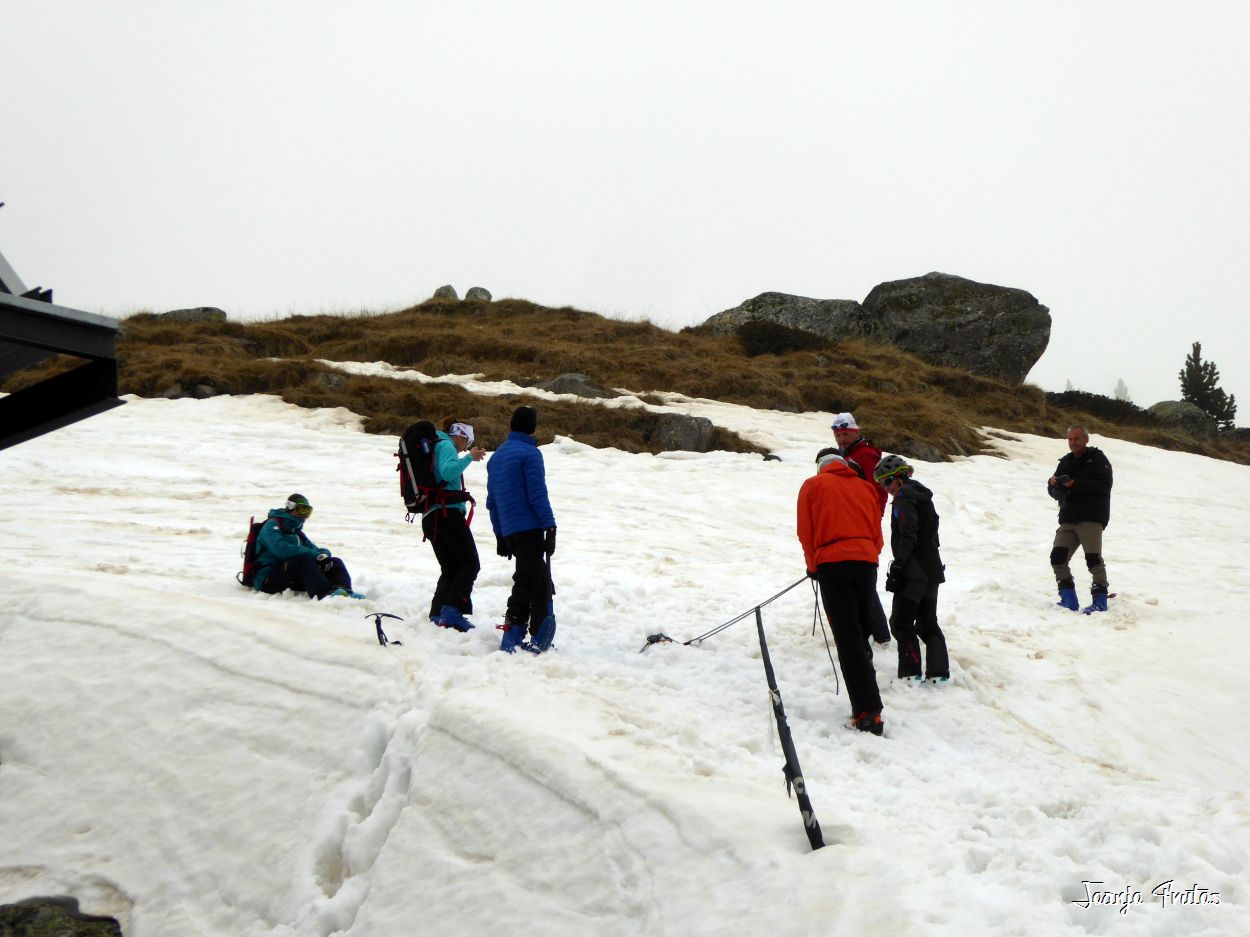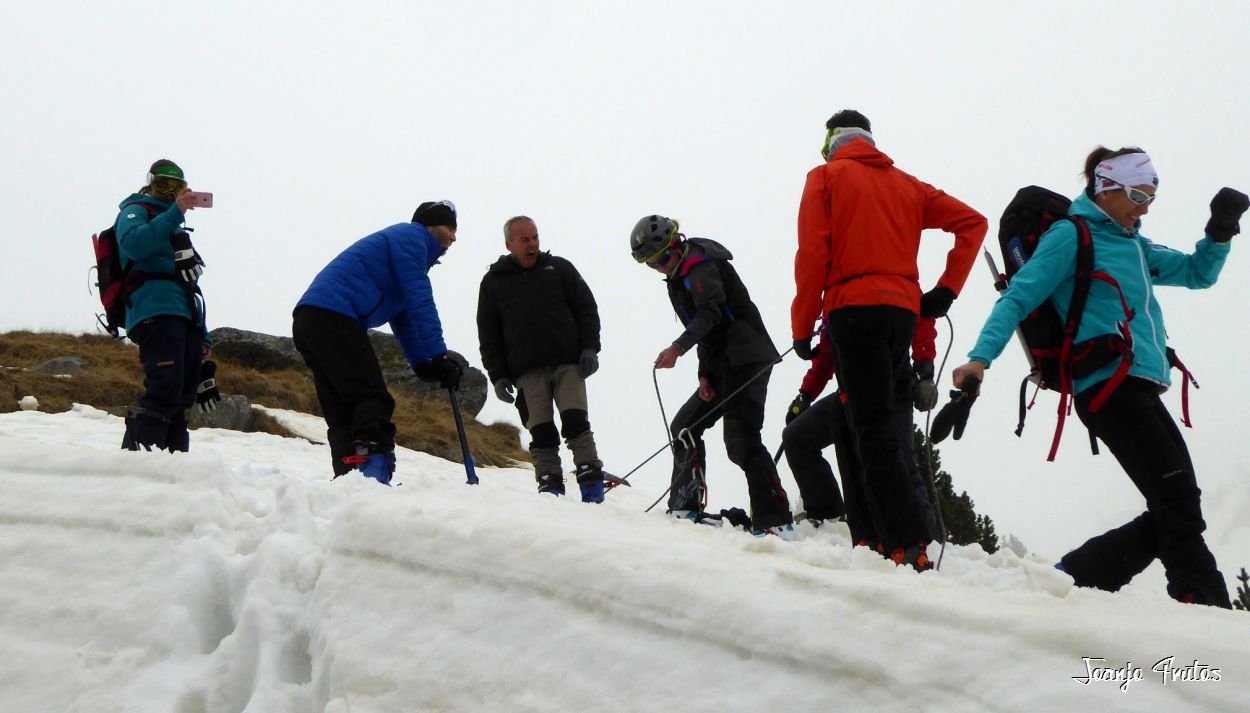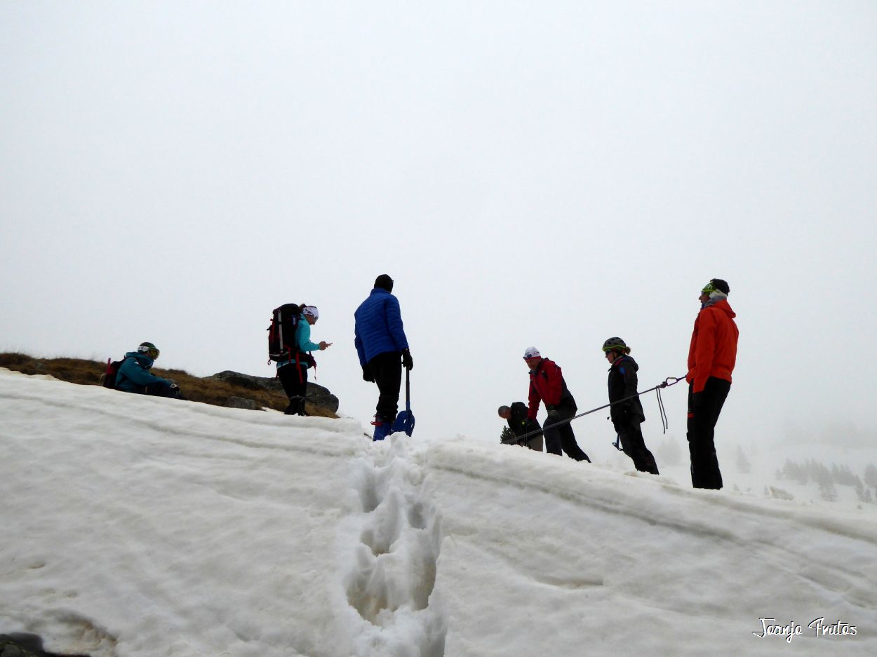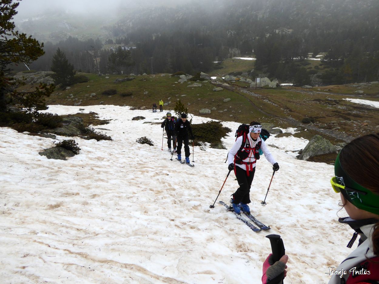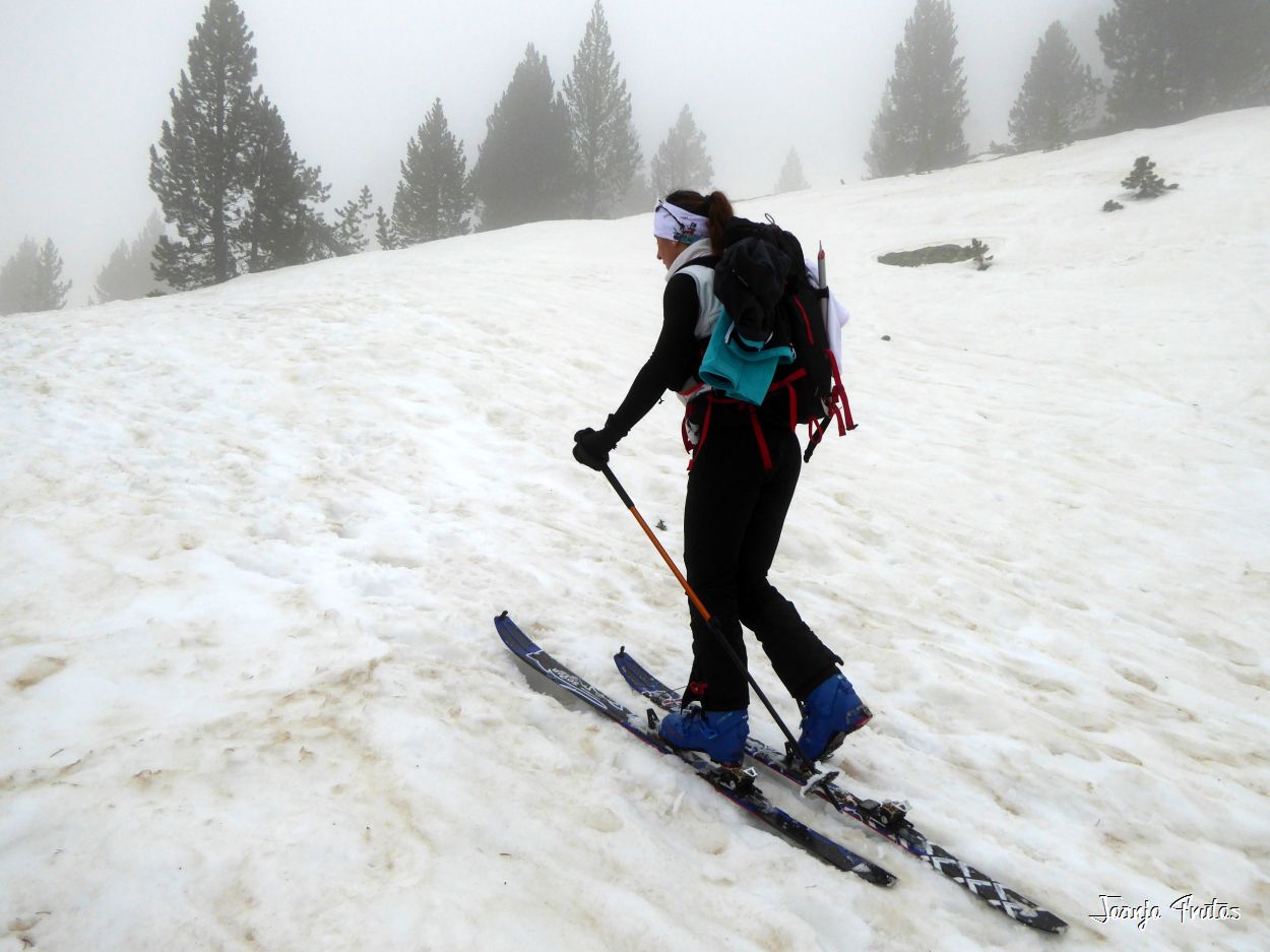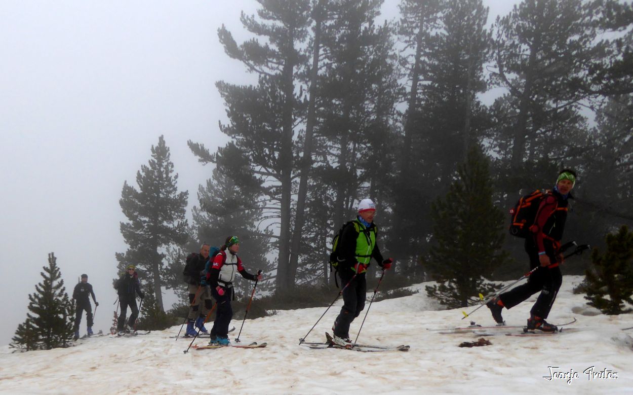 Tal y como amanecía hoy el día lo mejor era volver a la cama, pero la aventura es la aventura y la niebla me gusta y si es con nieve «podridilla» todavía más. Los compañeros merecían que no les dejara solos, mi sombra y yo, buscamos a Lucas y luego nos encontramos con el grupo de Chemari, Bea, Alva, Fran y Salva.