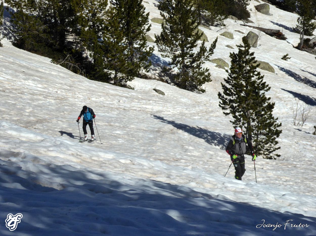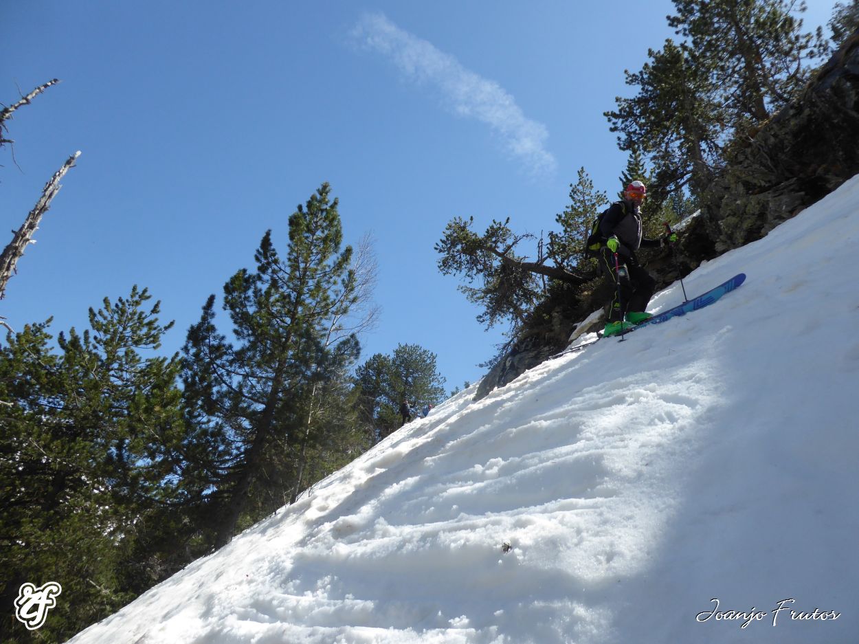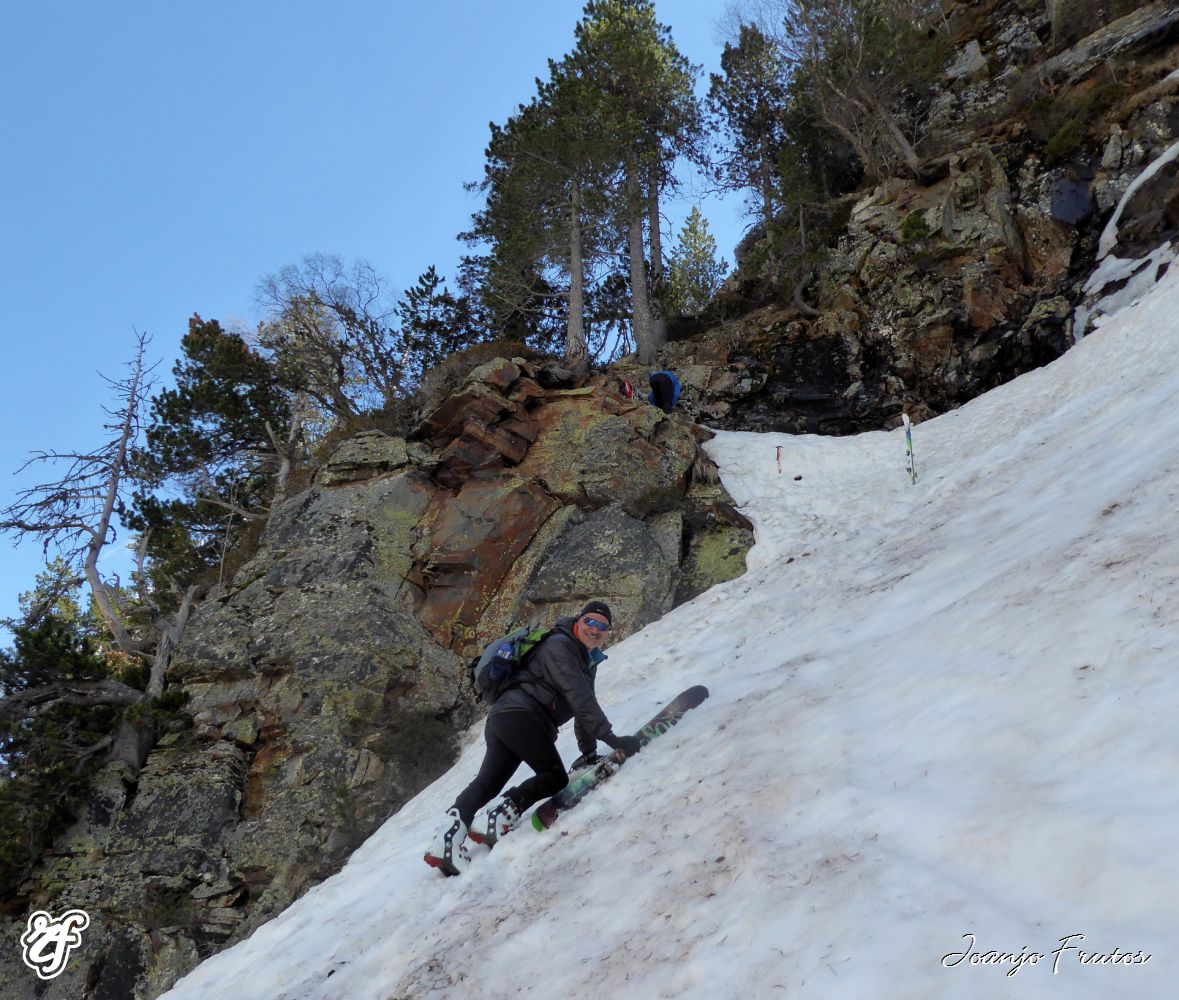 La nieve hay que buscarla igual que los huevos fritos con jamón del Refugio de La Renclusa, hoy aventura con Coco (el más serio de todos) y Lucas, Ángel, Bruno y el anfitrión, David, que nos ha hecho una demostración de como se baja con esquís.