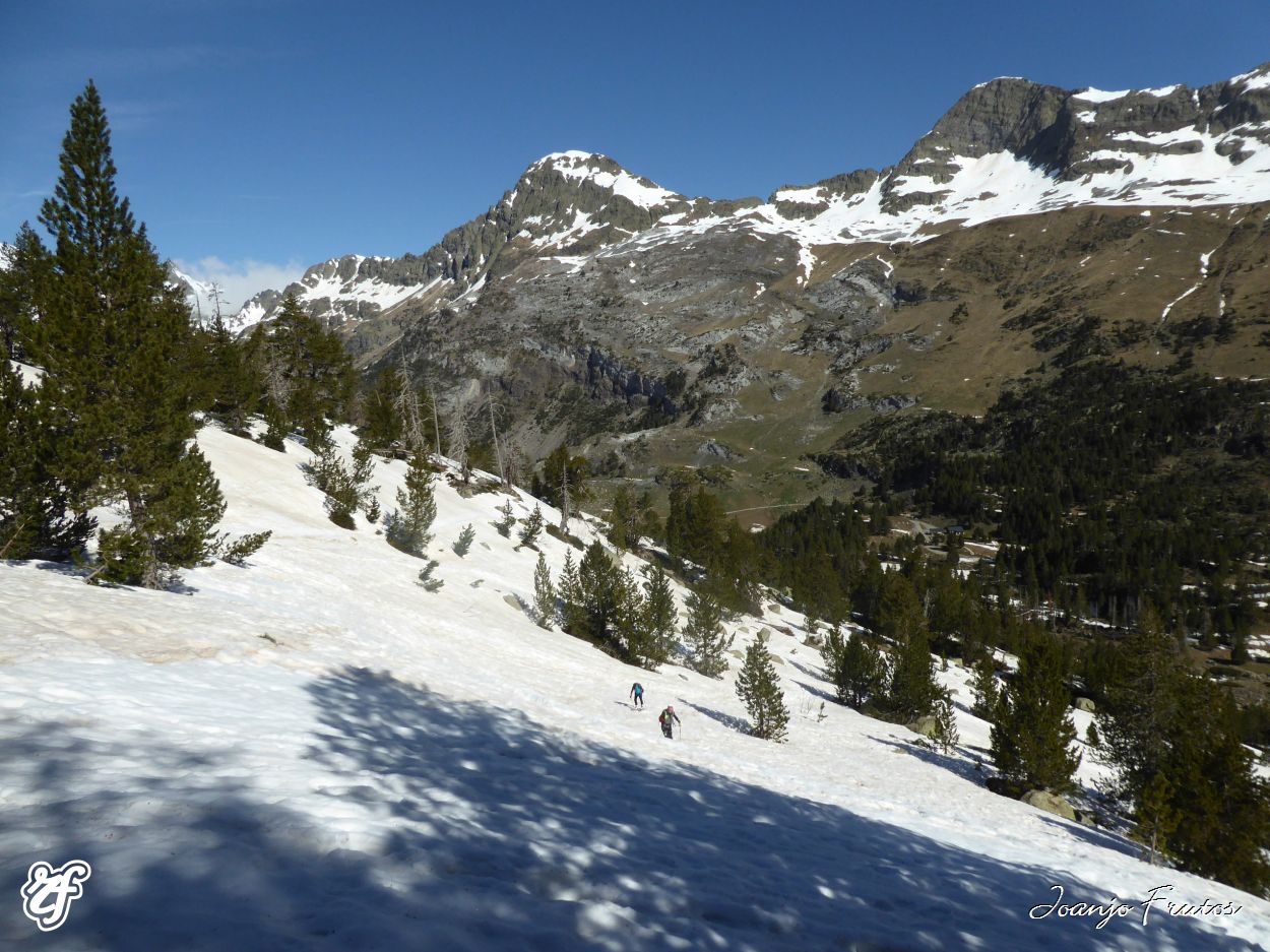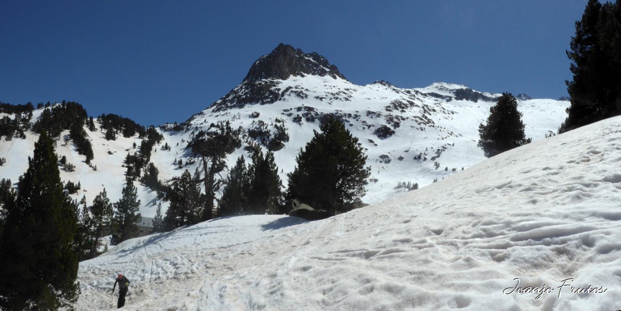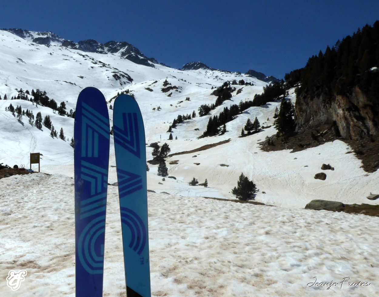 La nieve hay que buscarla igual que los huevos fritos con jamón del Refugio de La Renclusa, hoy aventura con Coco (el más serio de todos) y Lucas, Ángel, Bruno y el anfitrión, David, que nos ha hecho una demostración de como se baja con esquís.