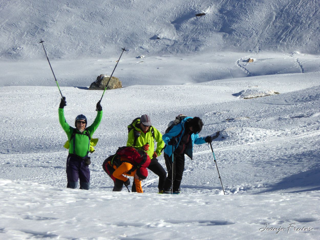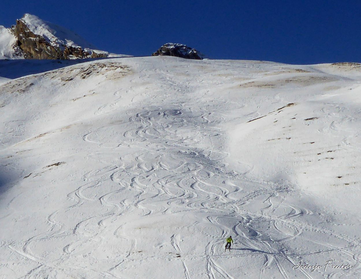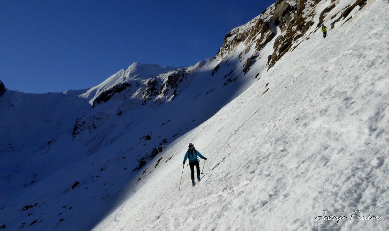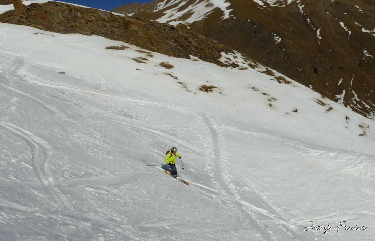 Salida de los límites de la estación de Esquí de Cerler, con esquís de travesía, amigos y cargados de buen humor, acceso con cierta dificultad y luego a la busca de la nieve que nos gusta esquiar, la nieve polvo que todavía se encuentra en las orientaciones norte, en las sombras de las montañas, evitando las zonas «marronáceas» que están heladas. Seguimos encontrando nieve como azúcar, imposible de compactar.
