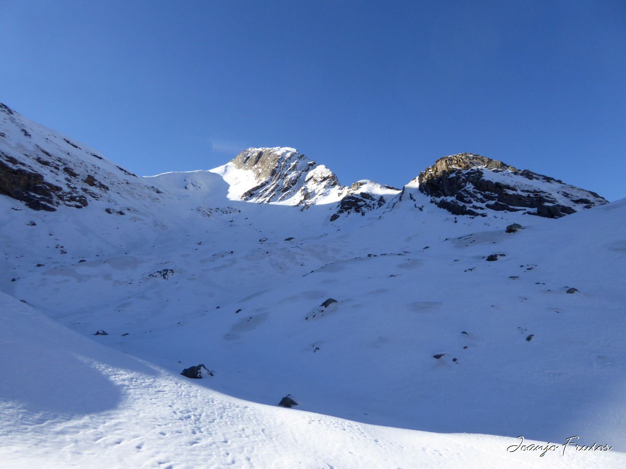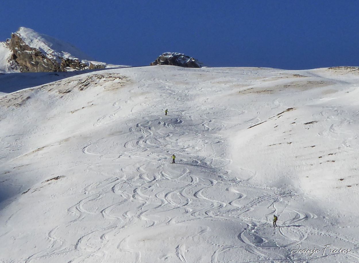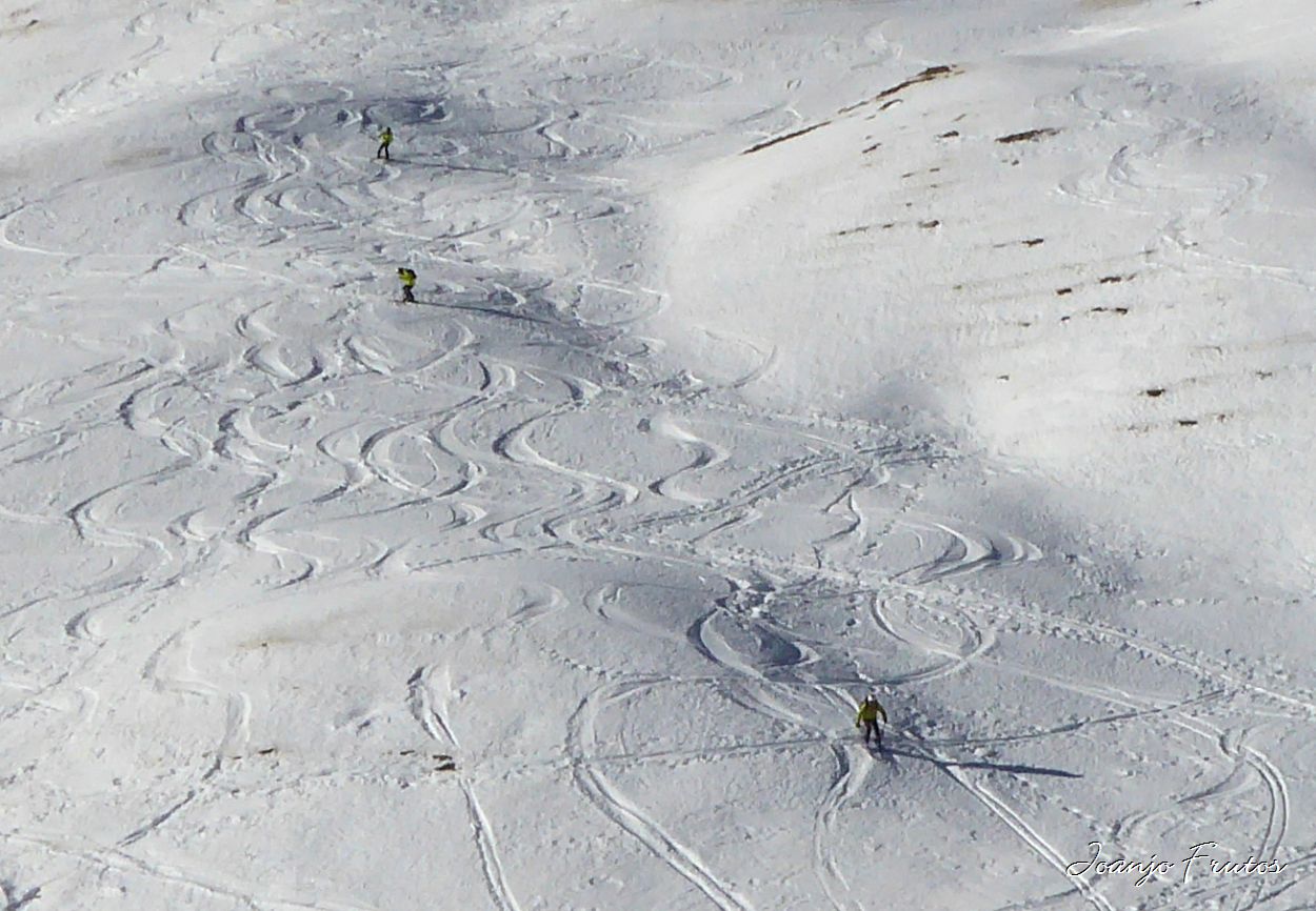 Salida de los límites de la estación de Esquí de Cerler, con esquís de travesía, amigos y cargados de buen humor, acceso con cierta dificultad y luego a la busca de la nieve que nos gusta esquiar, la nieve polvo que todavía se encuentra en las orientaciones norte, en las sombras de las montañas, evitando las zonas «marronáceas» que están heladas. Seguimos encontrando nieve como azúcar, imposible de compactar.