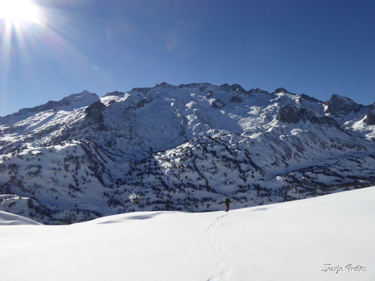 Llanos del Hospital, remontamos por la pista de fondo (sin pisar las huellas de fondo, por favor) hasta Plla de Están y para arriba como si fuéramos al Portillón de Benasque, cuando llegamos al altiplano, donde la famosa foto de la baseta, giramos un poco a mano derecha y llegamos a la boca del Puerto de la Picada, llegamos a ver la parte francesa al fondo y subimos a la Tuca para bajar por una preciosa pala.
