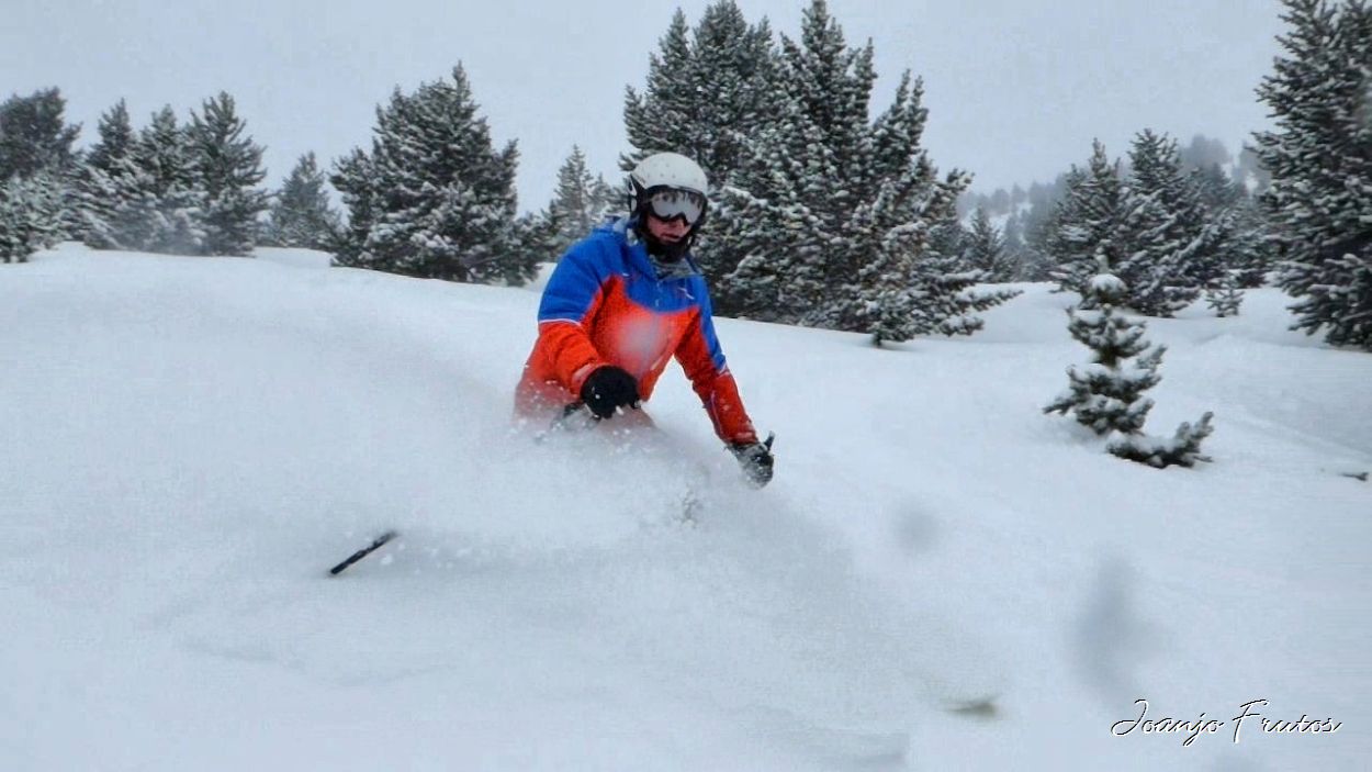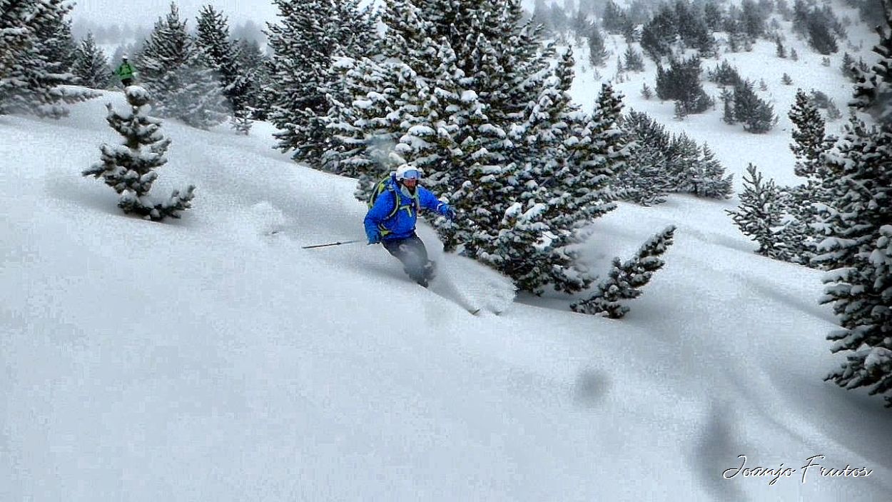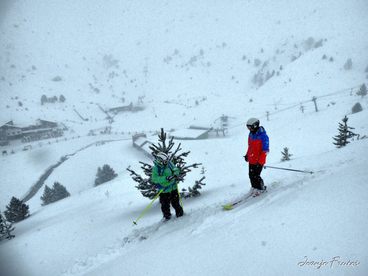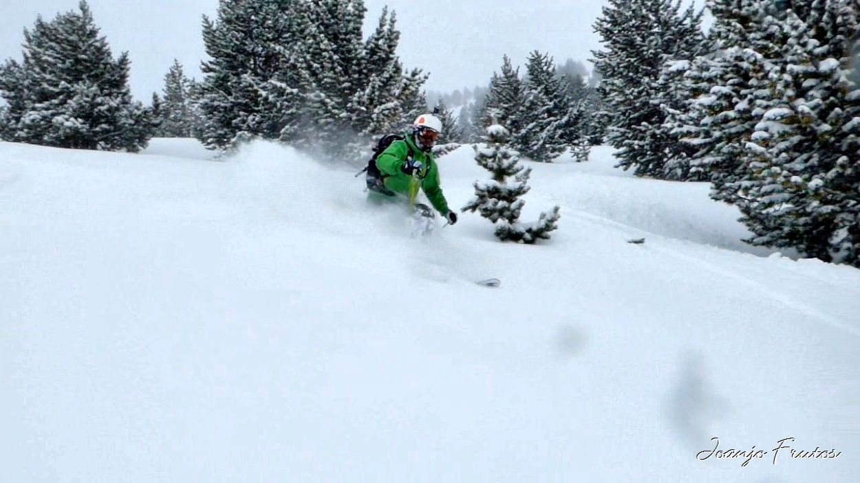 Vuelve a amanecer nevando, se intensifica y poco a poco en la estación se empiezan a oir ruidos, mejor dicho gritos de jubilo y alegría, mientras vamos marcando líneas en las zonas de árboles, ya que la visión es plana, pero con un buen colchón de nieve nueva, polvo y rápida, otra subida y aguantar hasta que queden piernas o la hora de comer.